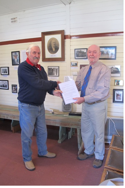 Peter Elliott, a descendant of early settler in the Gundaroo district Richard Elliott, donates a copy of his family history to G&DHS President Peter Firth in the Society’s room at the Gundaroo Literary Institute.